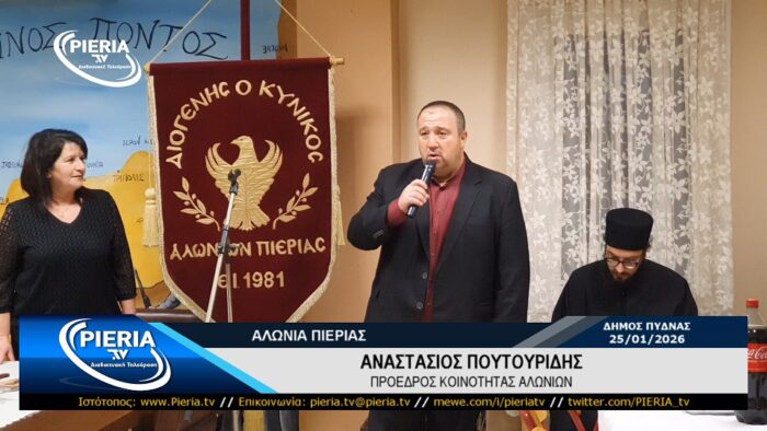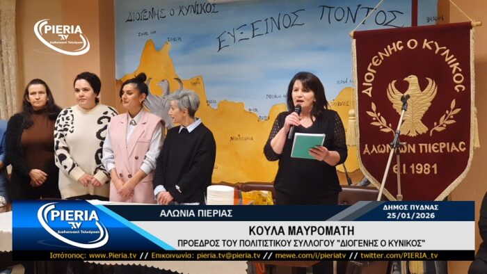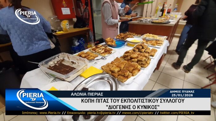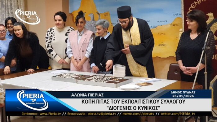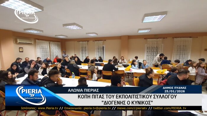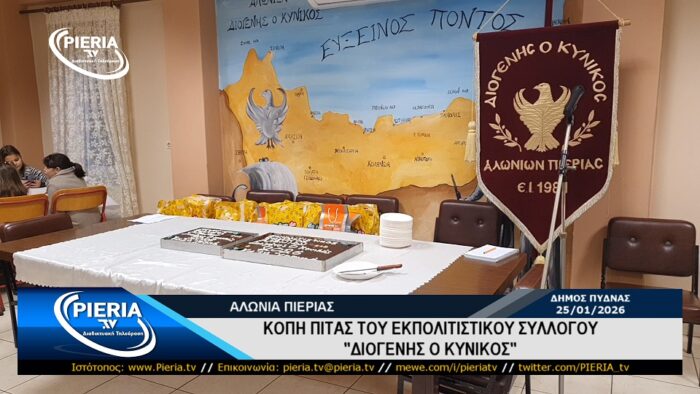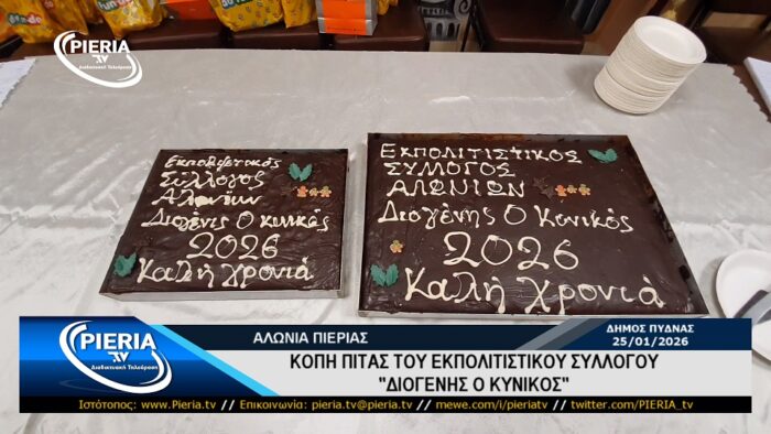 Το βράδυ της Κυριακής 25 Ιανουαρίου 2026 και στον χώρο πολλαπλών χρήσεων της κοινότητας του χωριού Αλώνια Πιερίας πραγματοποιήθηκε η κοπή της Βασιλόπιτας του Εκπολιτιστικού Συλλόγου «ΔΙΟΓΕΝΗΣ Ο ΚΥΝΙΚΟΣ» παρουσία πλήθους κόσμου που τίμησαν τον σύλλογο.